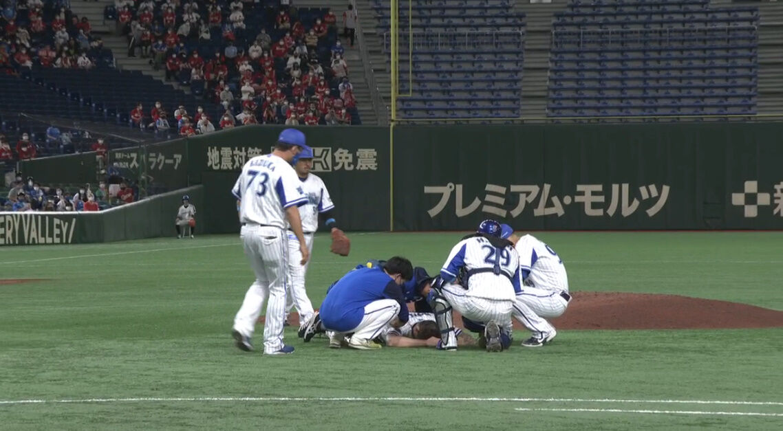 一死1、3塁 林の打席でピープルズが投球後にアクシデント