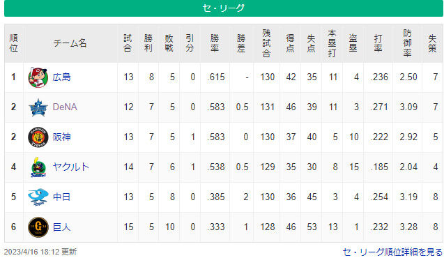 首位広島が5敗してて貯金3だからまあまあ拮抗してるんやな