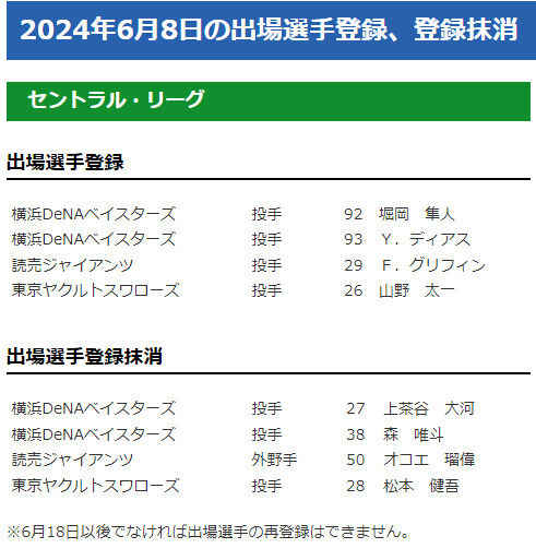 6/8(土)のセ・リーグ公示