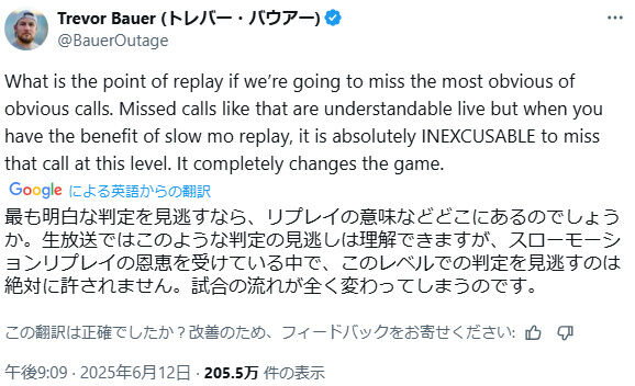 — Trevor Bauer (トレバー・バウアー) (@BauerOutage) June 12, 2025