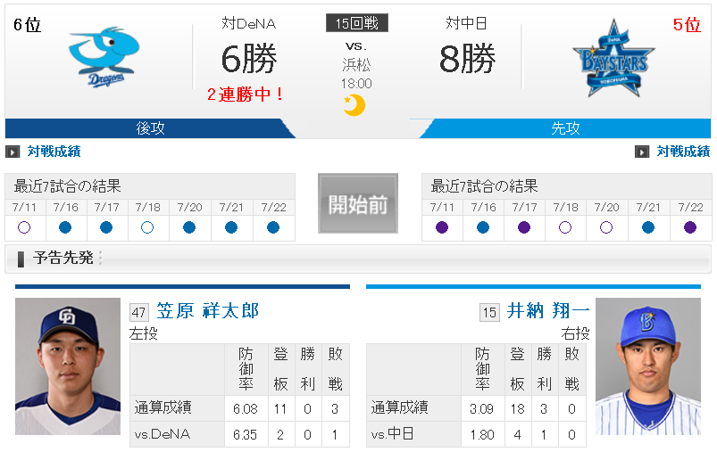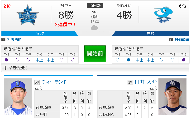【試合実況】[2018/7/9] DeNAベイスターズvs中日ドラゴンズ 18:00~