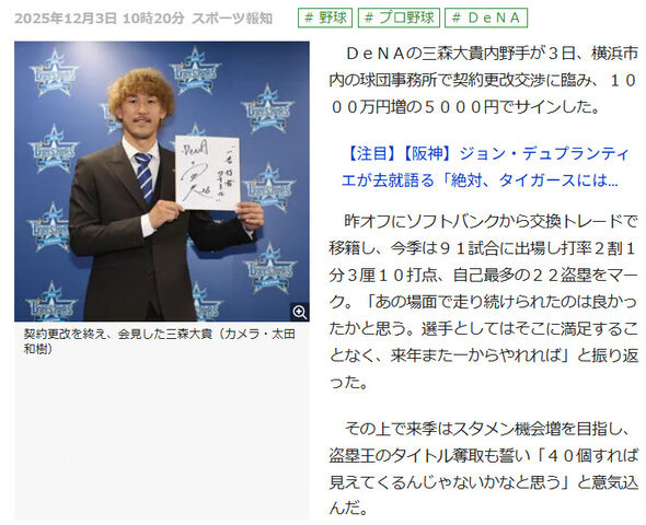 DeNA三森大貴 1000万円増の5000円で契約を更改 2025年12月03日 カテゴリ:三森大貴 726: 名無しさん 25/12/03(水) 10:25:22 ID:N1.yo.L80 728: 名無しさん 25/12/03(水) 10:26:44 ID:bR.du.L22あれだけ警戒されて走れるのは三森だけや731: 名無しさん 25/12/03(水) 10:27:32 ID:pv.cq.L14三森で勝てた試合はなんぼもある 727: 名無しさん 25/12/03(水) 10:26:12 ID:N1.yo.L80 DeNAの三森大貴内野手が3日、横浜市内の球団事務所で契約更改交渉に臨み、1000万円増の5000円でサインした。(ヽ*´◯`*) 続きを読む タグ :#三森大貴#契約更改