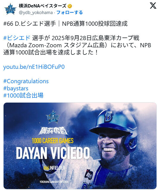 ▽DeNA・ダヤン・ビシエド「また日本に戻ることができ、そしてまたベイスターズでプレーできることを嬉しく思います。ベイスターズは上位を狙える強さがあり、チームメイトもみんなファミリーのように良い雰囲気で戦っています。その一員として、シーズンを通して怪我なく100%の力を出してチームに貢献していきたいです。今年はシーズン途中からの合流だったにも関わらず、いつも大きな声援を送ってくれて感謝しています。来年も頑張りますので、引き続き応援よろしくお願いします!」
